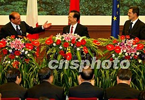中歐領導人第六次會談三十日在北京舉行。中國國務院總理溫家寶、歐洲理事會主席意大利總理貝盧斯科尼、歐盟委員會主席普羅迪等出席會談。鄭萍萍 攝