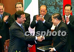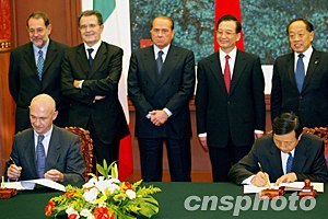 中國與歐盟三十日在北京簽署伽利略衛星導航合作協定等三個文件。中國國務院總理溫家寶、歐洲理事會主席意大利總理貝盧斯科尼(左三)、歐盟委員會主席普羅迪(左二)、歐盟共同外交與安全政策高級代表索拉納(左一)等出席簽字儀式。鄭萍萍 攝