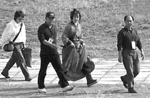 停車處與拍攝的大殿有幾百米距離,劉曉慶神態(tài)自若地與身邊人有說有笑。她看上去只有35歲上下,扮相頗像當(dāng)年的“武媚娘”。不少游客從她對面走過時,都沒認(rèn)出她就是劉曉慶。兩名專門從東陽市保安服務(wù)公司聘請來的保鏢也無事可做,一路上幫著她的化妝師、助理拎包。直到走到大殿,劉曉慶發(fā)現(xiàn)早早埋伏的記者們舉著“長槍短炮”,立刻變了臉色。保鏢和助理立刻高舉雙手阻止拍照。劉曉慶進殿后兩名保鏢把守住前后大門。