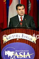 塔吉克斯坦共和國總統(tǒng)拉赫莫諾夫十一月三日在博鰲亞洲論壇2003年會(huì)上發(fā)表演講。中新社記者:毛建軍