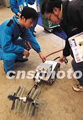 十一月六日在北京開(kāi)幕的“中國(guó)國(guó)際商務(wù)環(huán)境暨中國(guó)國(guó)際物業(yè)展覽會(huì)”上,從商務(wù)汽車、家庭汽車到商務(wù)寫(xiě)字樓應(yīng)有盡有。圖為天津宏點(diǎn)置業(yè)有限公司展示“沙漠風(fēng)暴”機(jī)器人。這種身價(jià)百萬(wàn)元的機(jī)器人可為星級(jí)賓館清潔空調(diào)和防范SARS作出貢獻(xiàn)。中新社記者:鄒憲