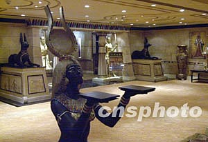 澳門博彩股份有限公司八日起首次舉辦娛樂場貴賓廳開放日,位于置地廣場的五個超豪華貴賓廳占地兩萬六千平方尺,以埃及文化為主題,一梁一柱均重現(xiàn)古埃及王朝的繁華景像。中新社記者:李剛