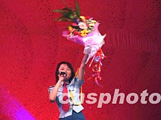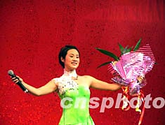 解放軍空軍十六日晚為中國航天科工集團公司061基地進行專場文藝演出,圖為女演員哈暉演唱歌曲《越來越好》。中新社記者 孫自法 攝