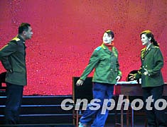空政話劇團演員在專場慰問演出中,為中國航天科工集團公司061基地表演小品《連長·媳婦·兵》。中新社記者 孫自法 攝