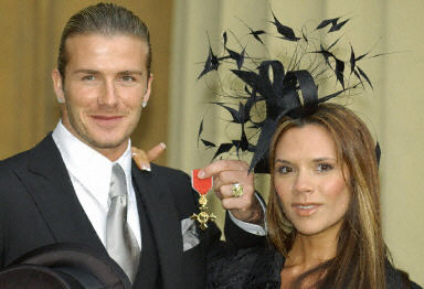 貝克漢姆的明星妻子“辣妹”維多利亞陪同貝克漢姆到白金漢宮參與典禮。她那專人設計的奢華發飾也頗搶鏡。