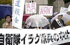 十二月一日中午,日本“和平遺族會”等多個民間團體和普通市民在首相官邸前舉行示威,反對向伊拉克派遣自衛隊。此前,日本兩名外交官在伊拉克遭襲身亡,該事件在日本社會引起震動。中新社記者:王健