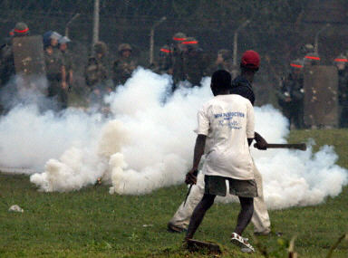 法國軍隊開始向示威人群發(fā)射擊催淚彈和震撼手雷,但更多的示威者仍源源不斷地向法軍基地開來,并且分批分撥地向法國軍事基地發(fā)動攻擊。法軍發(fā)言人向路透社記者證實說:“看樣子示威增援人員已經(jīng)開到了!边@些抗議者開始用石頭猛砸法軍基地,在基地入口焚燒輪胎,科特迪瓦的準(zhǔn)軍事部隊也趕到基地附近,但沒有干預(yù)抗議者的做法。