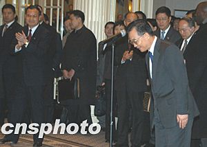 美東時間十二月七日下午,中國總理溫家寶甫抵紐約,即接見華僑華人、留學生和中資機構代表。溫家寶說,大家冒著嚴寒風雪,守候在這里好幾個小時,歡迎我和我的同事。大家的這份情意,不僅是給我和同事的,更是給祖國和人民的。他代表中國人民和中國政府,向旅居在美國的華僑、華人、留學生,向來自香港、澳門和臺灣的同胞,向領館的工作人員,致以親切的問候和良好的祝愿。隨后他向前方和左右三鞠躬,感謝僑胞們的熱情歡迎。作者:陳建