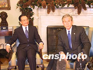 當天上午的歡迎儀式后,溫家寶與布什先進行了小范圍會談,會見了記者,然后雙方又進行了大范圍會談,就中美關(guān)系和一些重大國際問題交換了看法。
