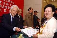 十二月二十二日,中國餐飲業最高獎項“伊尹獎”頒獎表彰大會在北京人民大會堂舉行,全國政協副主席周鐵農(左)等向劉寶等二十八名獲獎者頒發了證書。中新社記者:武仲林