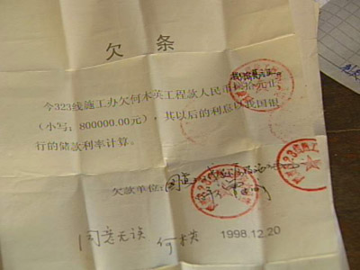 林景惠:“民工投勞力,還有一些小老板也代資。比如我們請(qǐng)下面的包工頭,給我們完成工程的話,我們第二步就給股份。第二步就答應(yīng)在一年內(nèi)加銀行利息,加倍的銀行利息給他們。”據(jù)調(diào)查,自1999年底新股東進(jìn)入后,合作三方股東打起了官司,一些包工頭和民工代表為追回工錢(qián),也將丙方告上了法庭,2001年,韶關(guān)中級(jí)人民法院執(zhí)行了財(cái)產(chǎn)保全,凍結(jié)了收費(fèi)站的1300萬(wàn)元收費(fèi)款。林景惠:“有約定完工過(guò)后就付清所有我的工資部分,付清80%剩余的部分就在六個(gè)月之內(nèi)全部付清。1996年6月份我就全部把工做完了,做完了就一直等錢(qián),一直等到現(xiàn)在。”記者:“一年以后工程完工了,但是你們卻沒(méi)有能力來(lái)支付民工這筆錢(qián)?”林景惠:“沒(méi)辦法。說(shuō)實(shí)話對(duì)民工這個(gè)欠款我是深表同情的,所以從1996年開(kāi)始全部收入基本上來(lái)講,就給這個(gè)工程隊(duì)我們都有付的清單。”記者在收費(fèi)站采訪時(shí),正碰到幾個(gè)民工拿著判決書(shū)來(lái)討工錢(qián)。在調(diào)查中記者發(fā)現(xiàn),有些判決已生效3年多,但民工還是沒(méi)有拿到工錢(qián)。記者:“這些錢(qián)全部就給了施工隊(duì),付給施工隊(duì),施工隊(duì)總共欠了才一千多萬(wàn)。你這兩千多萬(wàn)都給他了,那就應(yīng)該說(shuō)是早還清了,實(shí)際上你們欠了不止一千多萬(wàn)。”民工:“實(shí)際不止,所欠的款項(xiàng)應(yīng)該是達(dá)到了三千萬(wàn)吧,兩千多萬(wàn)、三千萬(wàn)左右。”