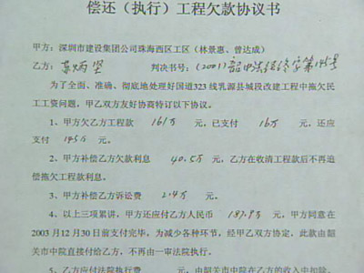 丙方:“當(dāng)時(shí)我們約定以后,我們實(shí)際收到廣西方590萬(wàn),還有410萬(wàn)沒(méi)有到我們賬號(hào)。做工程的過(guò)程當(dāng)中,由于縣里面自己擴(kuò)大規(guī)模,增加工程量,使我們的工程越做越大。越做工程量越大費(fèi)用也越高。”記者:“投資成本就在原來(lái)的基礎(chǔ)上增加多少呢?”丙方:“按照我們現(xiàn)在最小的工錢(qián)量是5500萬(wàn),增加了1800多萬(wàn)左右。”林景惠告訴記者,工程完工后所欠民工工資實(shí)際已經(jīng)達(dá)到3000多萬(wàn)元,他們每月都在逐漸還民工的工錢(qián),那么,為什么還有1300萬(wàn)元工程款拖到現(xiàn)在還沒(méi)有付清,是因?yàn)?000年初深圳市國(guó)資辦的一紙文件把股權(quán)轉(zhuǎn)到了深圳市深發(fā)貿(mào)易公司名下,新股東沒(méi)有履行支付民工工錢(qián)的職責(zé),造成了今天還拖欠民工工資。