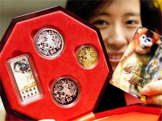 這3枚猴年紀念幣分別是幣值250新元(下同)金幣,10元銀幣和銅鎳幣。整個配套售價1633元。此外,造幣廠也將陳文希的猿猴圖制成大小不一的金、銀章,售價從28元到248元不等。
