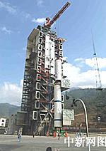 圖:"長(zhǎng)征二號(hào)丙"改進(jìn)型運(yùn)載火箭一、二級(jí)吊裝上發(fā)射塔架(12月30日 03:47)