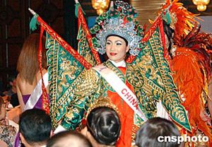 今年十九歲的中國小姐邢會原以一身京劇中的“大靠”形象進場,英姿颯爽中掩不住萬般嫵媚,引起觀眾一片驚艷;并因此獲得了“最佳民族服裝獎”稱號。她目前在英國牛津布魯克斯大學攻讀法律和市場營銷專業的雙學位。賽后她表示,雖然自己很興奮能拿獎,覺得是為中國爭光,但仍將繼續學業,因為她認為學習最重要。