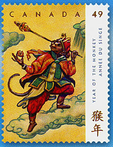 發行的2款猴年郵票取材于中國古典名著“西游記”故事中的美猴王孫悟空。面值49加分國內郵資郵票發行量800萬張,面值1.4加元國際郵資郵票發行量170萬張。畫面分別是陪同唐僧去“西天”取經途中手執金箍棒騰云駕霧的孫悟空和與玉皇大帝智斗鬧天空的孫悟空。該組郵票設計者為安大略藝術學院畢業的路易斯費肖夫,他曾設計許多加拿大郵票圖案。