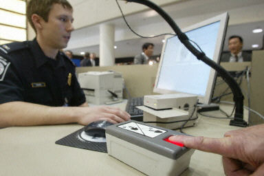 2004年1月5日,在洛杉磯國際機場,美國海關及邊境安全部門的官員展示新的指紋識別及拍照系統。從5日起,美國全境將推廣使用該系統,對進入美國的外國游客進行身份識別。