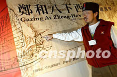 “臺灣山河探險協(xié)會”理事長徐海鵬一月八日在北京舉行的新聞發(fā)布會上介紹鄭和下西洋航海路線圖,并號召海峽兩岸共同參與“鄭和八下西洋”探險活動,以紀(jì)念明朝偉大航海家鄭和六百年前下西洋的壯舉。探險隊在精心挑選隊員后,將于2005年啟航,歷時三年走訪二十余個國家、數(shù)十個港口,2008年返航。中新社記者:毛建軍