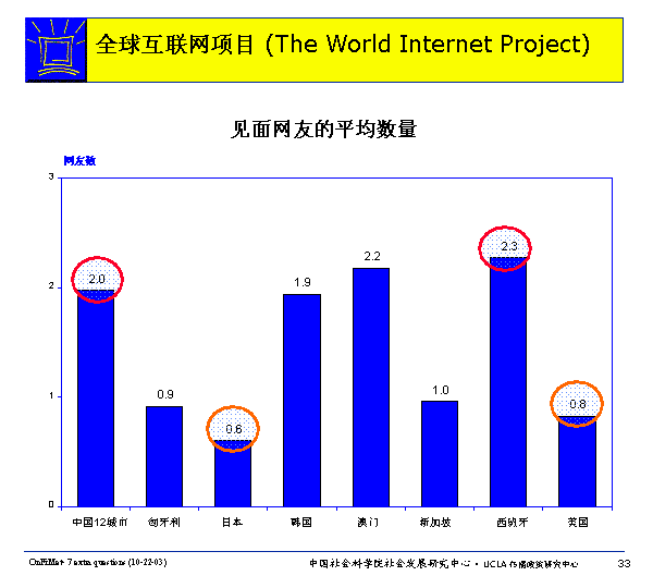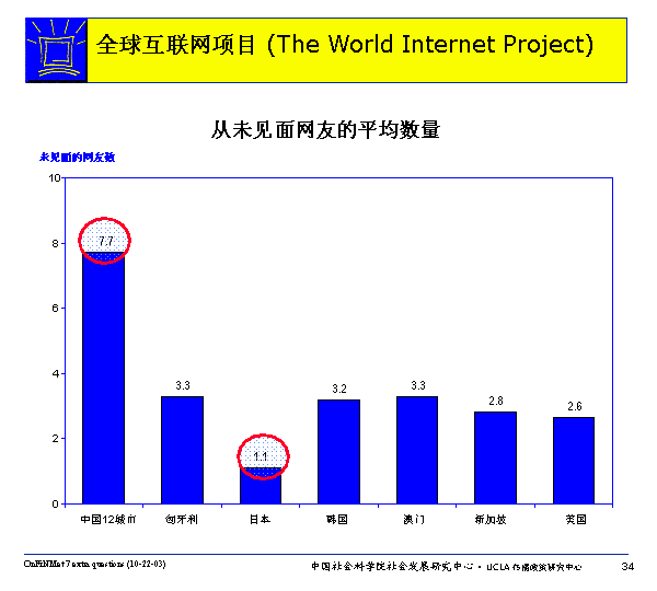 不同國家的網民中從未和網友見面的人的比例也不相同。在這方面,中國網民中從未和網友見面的人數最高,達到了7.7%,而日本則最低(1.1)。當然,這還需要參照各國網民實際在網上交友的數量進行比較研究。