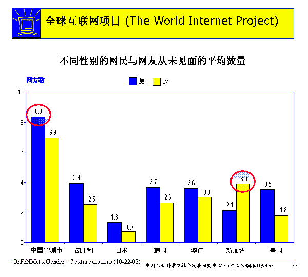 在大多數國家里,男性網民與網友從未見面的平均數量要多于女性網民。例外的國家是新加坡。