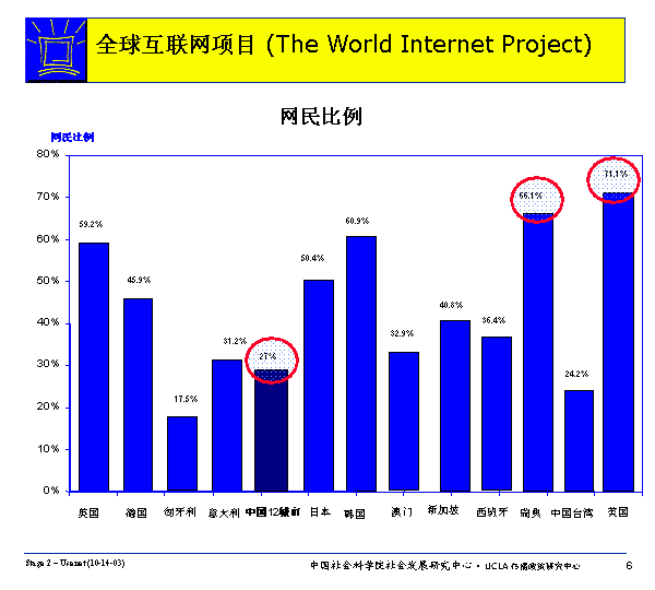 WIP項目各國的網民比例各不相同,美國最高(71.1%),除中國外,匈牙利最低(17.5%)。按照中國互聯網信息中心(CNNIC)的統計,中國網民占人口的比例大約為5%,按照這次參加“全球互聯網項目”的中國社會科學院社會發展研究中心對12個城市調查的數據,網民占被調查城市的人口比例為29%。