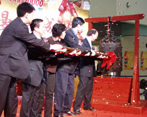 廟會開幕式上,商城總經理與顧客一些撞響開幕鐘。甄雪原攝