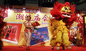 時近春節,以現代潮流著稱的北京東方廣場將中國傳統廟會形式搬入東方新天地商城內,以營造濃濃的中國民俗風情。圖為商城內進行的舞獅表演。甄雪原攝