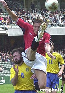 “2004嘉士伯杯”足球邀請賽元月二十二(農(nóng)歷年初一)在香港大球場舉行,在首場比賽中瑞典隊與挪威隊對陣,圖為瑞典隊球星在場上展示精彩球技。作者:錢興強
