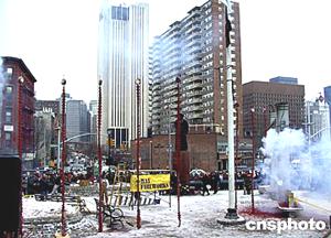 約華人社團在華埠東百老匯且林是果廣場燃放爆竹,辭舊迎新。作者:趙海燕