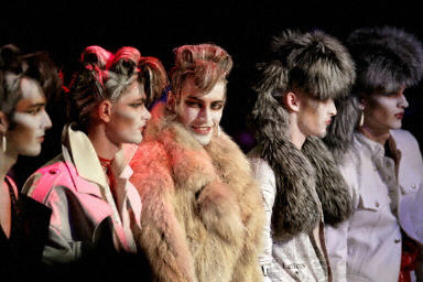 在法國時裝周,模特展示英國時裝設(shè)計師John Galliano設(shè)計的2004/2005秋冬流行男裝。