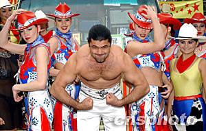俄羅斯莫斯科馬戲團(tuán)2月5日移師觀塘,全新節(jié)目首次在香港曝光,包括珍貴的白老虎、雜耍藝術(shù)、狗仔足球隊、艷麗四射的舞蹈等節(jié)目,給觀眾帶來刺激和歡樂。圖為馬戲團(tuán)大力士弗克烈甸與艷麗四射的舞蹈女郎。作者:洪少葵