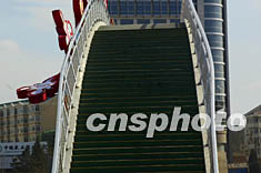 發生踩擠事故造成人員傷亡的北京密云云虹橋護攔被擠彎。中新社記者:宋吉河