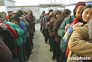 在河南省駐馬店市上蔡縣蘆崗鄉文樓村衛生所,村民們排隊等候領取免費藥品。文樓村是一個艾滋病疫情高發村,三千二百多村民中有數百人染上愛滋病。現在村民凡出現頭疼、拉肚子的癥狀,都能在衛生所領取免費藥物。作者:慎重