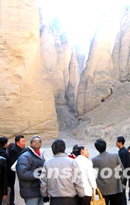 中國(guó)國(guó)土資源部日前公布,四川九寨溝、甘肅景泰石林等被評(píng)為“國(guó)家地質(zhì)公園”。甘肅景泰石林位于甘肅省景泰縣,生成于四百萬(wàn)年前,由地殼運(yùn)動(dòng)、風(fēng)化、流水侵蝕和重力崩塌形成,其石柱、石筍均由桔黃色砂礫巖構(gòu)成,大多高達(dá)八十至一百米之間,最高達(dá)二百多米。圖為聯(lián)合國(guó)教科文基金水利工程協(xié)會(huì)的專(zhuān)家前來(lái)考察屹立在黃河兩岸的甘肅景泰石林。作者:殷春永