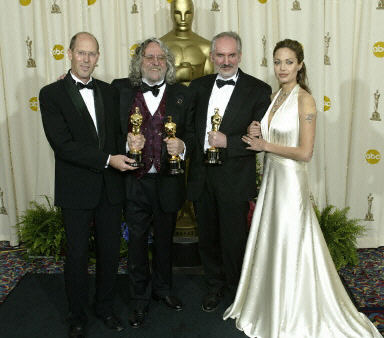 《指環王3:王者回歸》獲最佳美術指導獎,安吉麗娜·朱莉為三位美術指導頒獎。