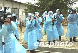 澳門特區民政總署和珠海出入境檢驗檢疫局一日在珠海舉行會議,就恢復因禽流感而中斷的活雞輸入問題進行協商并達成共識,雙方決定報國家有關部門批準后,從三月五日起同步恢復活雞、冰鮮雞、和凍雞的供應。圖為前往珠海養雞場采訪的眾媒體記者們為確保雞只的健康,也不得不穿上隔離防護服工作。作者:李剛