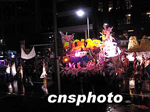 澳洲第一大城市悉尼6日晚舉行同性戀大游行,十萬人冒雨上街看熱鬧。幾十輛花車、數千人的化裝游行隊伍在雨水中緩緩行進。最后一輛花車上書“要愛不要戰爭”。           中新社記者 劉雨生 攝