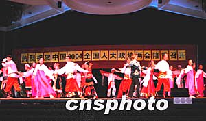(美國東部時間)三月六日晚,來自世界各地的兩千多人參加了在紐約舉辦的二○○四年“科學、健康、文明”學術研討會。圖為大會開幕晚宴上,與會的學子載歌載舞,祝賀中國全國人大、政協會議三月初在北京召開。作者:陳建