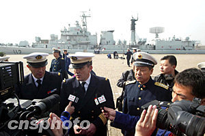 法艦進(jìn)港時(shí),碼頭舉行歡迎儀式。兩名兒童分別向“拉圖什特威爾”號(hào)反潛驅(qū)逐艦艦長(zhǎng)阿蘭·克里斯蒂安和“比羅司令”號(hào)輕型護(hù)衛(wèi)艦長(zhǎng)讓·夏爾獻(xiàn)花,北海艦隊(duì)副參謀長(zhǎng)趙永青主持歡迎儀式并致歡迎詞。青島市外辦領(lǐng)導(dǎo)和駐青官兵200余人參加了歡迎儀式。