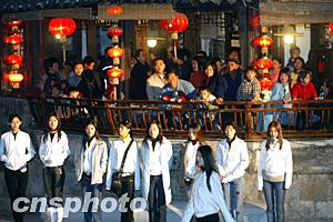 三月十三日晚,參加“古鎮(zhèn)西塘”2004年國(guó)際旅游小姐大賽中國(guó)區(qū)總決賽的三十二名參賽佳麗在西塘古鎮(zhèn)新搭建的水上舞臺(tái)排練,吸引了不少觀眾觀看。中新社記者:盛佳鵬