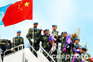2004年3月16日上午10時(shí)30分,沈陽桃仙國際機(jī)場(chǎng)一架滿載70名維和部隊(duì)先遣隊(duì)官兵的專機(jī)起飛,直飛福州與那里的維和部隊(duì)汽車連會(huì)合共同組隊(duì)經(jīng)法國飛抵利比里亞首都。三月底由沈陽軍區(qū)派遣的維和工程兵部隊(duì)將與先期到達(dá)的先遣隊(duì)會(huì)合,共同完成利比里亞的維和任務(wù)。夫子 攝
