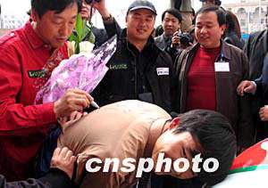 三月十八日,中國車王盧寧軍和他的“座騎”中國出產的帕拉丁汽車亮相蘭州,熱情的車迷請盧寧軍為在衣服上簽名。作者:劉呈軍