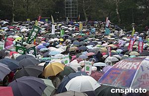 數(shù)萬日本民眾三月二十日在東京舉行反戰(zhàn)集會(huì),他們高舉標(biāo)語(yǔ)牌要求日本自衛(wèi)隊(duì)從伊拉克撤兵。作者:王健