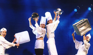 三個些許瘋狂的"廚師"和略帶頑皮的助手正準備開始一天的工作,搬蔬菜,挪凍肉,整理廚具……主管突然宣布要完成一場盛大的婚宴,在下午6點之前要作完訂單上的菜,還介紹他不懂料理技術(shù)的侄子來幫忙,可是時間非常緊迫,在這樣令人窒息又緊張的時刻,總管當然希望所有的準備工作都能按部就班地照章完成。但是幾個廚師卻如何都統(tǒng)一不起來,又看不順眼總管的侄子,相互敲擊的混亂場面也就由此而生。在傳統(tǒng)表演中使用的打擊樂器被廚房中不同種類的日常廚具所代替,砰砰地敲擊出頗有韻律的節(jié)奏,伴隨著玩耍的歡呼,廚師們用詼諧幽默的肢體動作,把一場烹飪工作演變成戲謔的惡作劇,卻帶給觀眾視覺的沖擊和聽覺的震撼,引得觀眾不由自主地想要參與其中。當"廚師們"完成精美的菜肴,表演也進而達到了極致。
