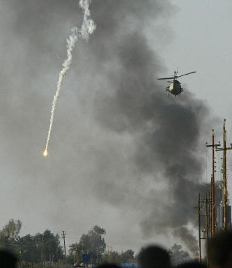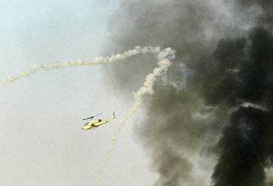圖為一架駐伊聯(lián)軍的直升機在一著火的加油站上空盤旋。