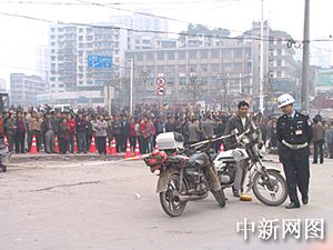 在距事故現(xiàn)場約三公里的地方,各主要交通干道已經(jīng)設(shè)置了路障,不允許車輛進入。在離化工廠約兩公里處,醒目的警戒線已經(jīng)攔住了公路,數(shù)十名警察正在幫助附近的居民疏散。