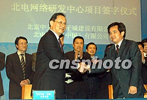 四月十九日,北電網絡與北京中關村電子城建設有限公司在“新北京,新奧運——中國和世界的商機”奧運經濟市場推介會上洽談,創建北電網絡研發中心。圖為北電網絡全球副總裁毛渝南(左)與北京中關村電子城建設有限公司簽約。