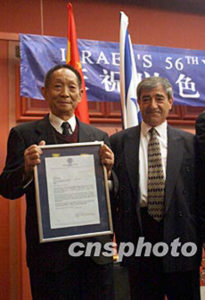 中國國家雜交水稻工程技術研究中心主任袁隆平教授被授予2004年度沃爾夫農業獎,以獎勵他在雜交水稻方面所進行的革新性培育和對雜交優勢遺傳基礎的發現。四月二十六日晚在北京舉行的慶祝以色列國獨立五十六周年招待會上,由以色列駐華大使海逸達博士(右)親自向給袁隆平教授(左)轉交以色列教育、文化及體育部長和沃爾夫基金會理事會主席莉默.利維納特女士給袁隆平教授的獲獎信。中新社記者:張勤