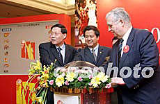 4月28日,2004-05CBA聯賽商務推介會在北京舉行,這個賽季的比賽將在賽制和招商模式上進行重大改革:南北分區的新賽制、公開透明的招商模式、為球迷、贊助商和媒體服務。圖為籃管中心主任李元偉(左一)與嘉賓共同開啟新賽季南北雙方參賽隊伍。中新社記者:盛佳鵬