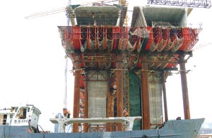 航道對上的橋面已接近合龍,每日均有工程船將每件重逾百噸的巨型預(yù)制件吊到橋面裝嵌。
